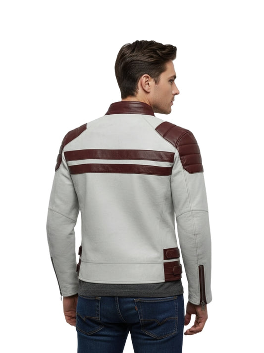 Men's White & Maroon Striped Leather Biker Jacket