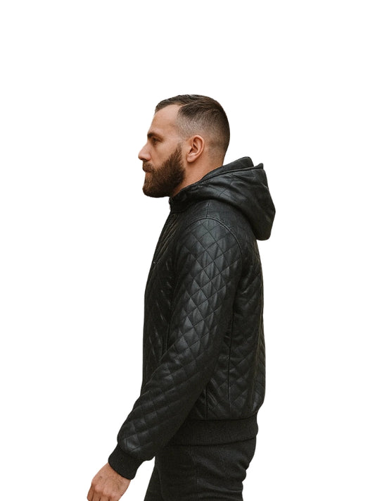 Black hooded bomber Quilted Leather Jacket