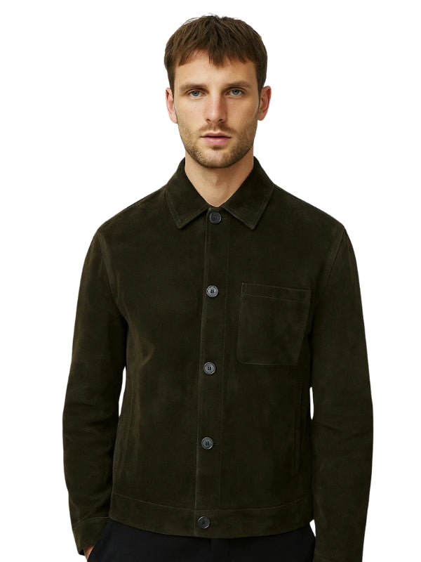 Men's Real Suede Slim Fit Polyester Lining Long Sleeves Green Jacket